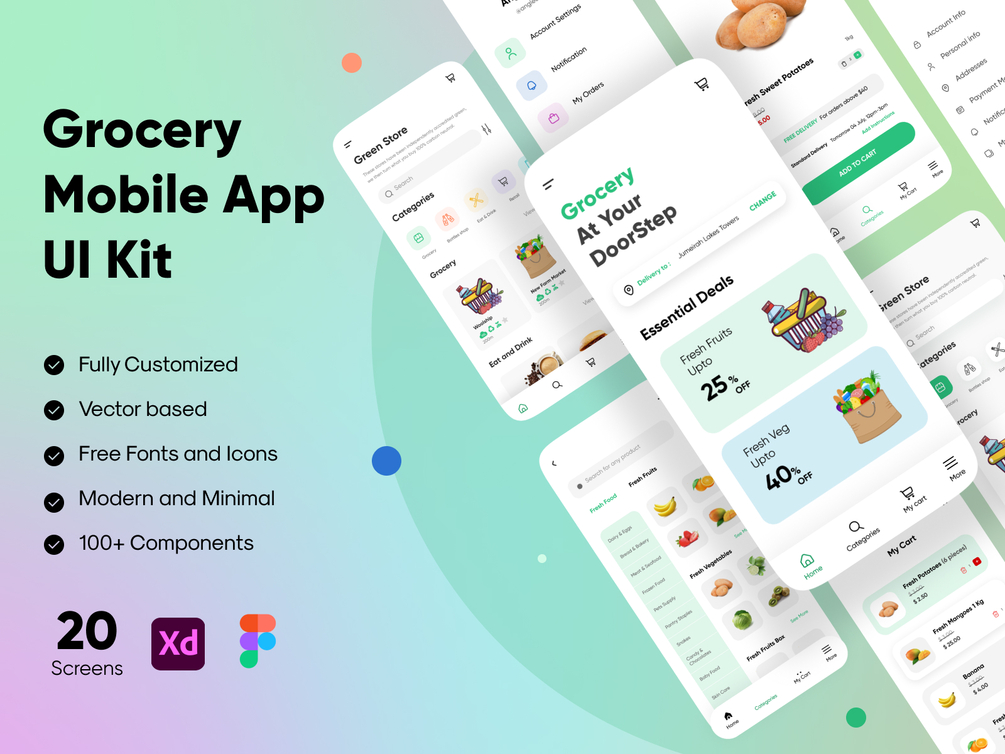 It is a Grocery Mobile App UI Kit designed for online shopping for your essential products. This UI kit contains 20 high-quality mobile screens. It is compatible with Adobe xd and Figma. All the elements and components are easily editable. UI Kit is fully customized and vector-based.